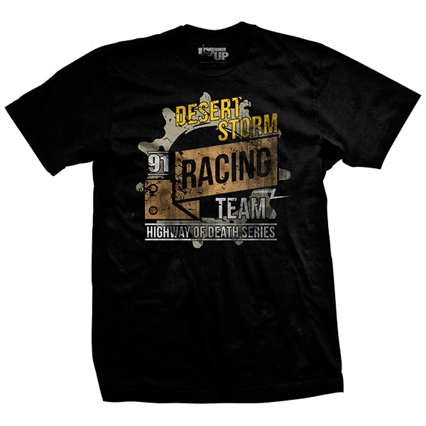 We don’t always go to war, but when we do . . . sometimes it only takes a few days of ground combat and a month of a relentless air strikes to decimate a nation’s armed forces. Yes, we’re talking about Desert Shield/Desert Storm, one of the most epic military campaigns in the history of the world. Old Uncle Saddam got a little greedy back in the early 90s. He was so greedy that he decided it would be appropriate to invade his tiny neighbor, Kuwait. Nobody likes a bully, so some of the other neighbors got together and decided they needed to force him back into his property. Enter Kuwait, Saudi Arabia, the United Kingdom, France, Italy, Canada, Egypt, Syria, Morocco, UAE, Pakistan, Oman, Qatar, Bangladesh and the United States of America. They organized, had a clear mission, and had a clear plan. The next step was to launch an assault that made Hitler’s Invasion into Poland look like a bush league campaign. The reclamation of Kuwait essentially turned into a drag race between nations over who could do the most damage to Iraqi Forces. We’re talking, a straight free-for-all. Air. Armor. Infantry. Naval power. Everyone was getting theirs. It all culminated on Highway 80 during the last days, when allied pilots set the real life difficulty level to easy and went to town on fleeing Iraqi forces. Did you participate in the great race of ’91? We have a shirt for you.